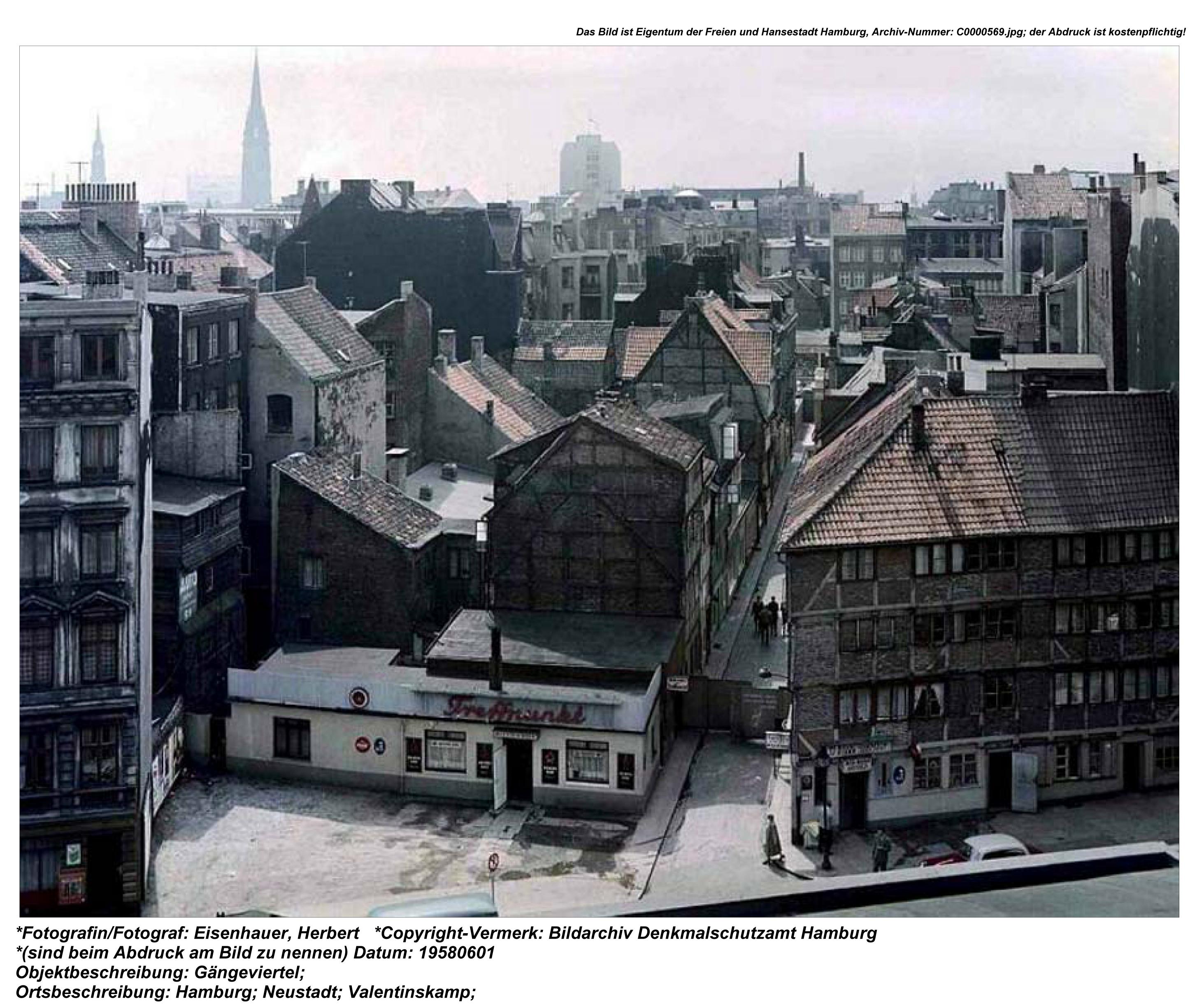 Die Stadt Hamburg pflegte, im Gegensatz zum Rest des Deutschen Reiches, traditionell einen eher toleranten Umgang mit dem Rotlichtgewerbe. Zahlreiche Straßen in der Alt- und Neustadt verfügten über mindestens ein Bordell, einige sogar über mehr als ein Dutzend. Der Ebräergang wurde wegen seiner zahlreichen Etablissements im Volksmund schlicht in Ehebrechergang umgetauft. In der Speckstraße, die auch Teil des heutigen Gängeviertels ist, gab es 1893 16 Bordelle mit insgesamt 65 Prostituierten, die sich die Straße mit 150 Familien mit 220 Kindern teilten. Die unmittelbare Nachbarschaft von Anwohner*innen und Prostituierten führte immer wieder zu Konflikten und Sorgen über die moralische Verwahrlosung der Bewohner*innen der Gänge. Dennoch hielt sich das Gewerbe erstaunlich lange in der Innenstadt und erst Ende der 1950er-Jahre verschwand mit der Ulricusstraße, die dem Bau des Unilever-Hochhauses weichen musste, der letzte Rest des innerstädtischen Rotlichtbezirks.