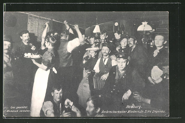 The Gängeviertel were known, in Hamburg and beyond, as a hotbed of crime and prostitution. In the tales and imaginations of the wealthy elites, coups and crimes were planned on a permanent basis in the basement bars and pawn shops of the neighborhoods – an image not too far from the truth. The raging poverty and the unsteady employment in the harbor forced many inhabitants of the Gängeviertel to make a living in crime and prostitution. Apart from burglaries, pickpocketing was common and the loot was usually sold right in the neighborhood. Pursuing the thieves was usually pointless or even dangerous, due to the practical solidarity of the inhabitants – this extended to the police, who usually only entered the Gänge with sufficient back-up.