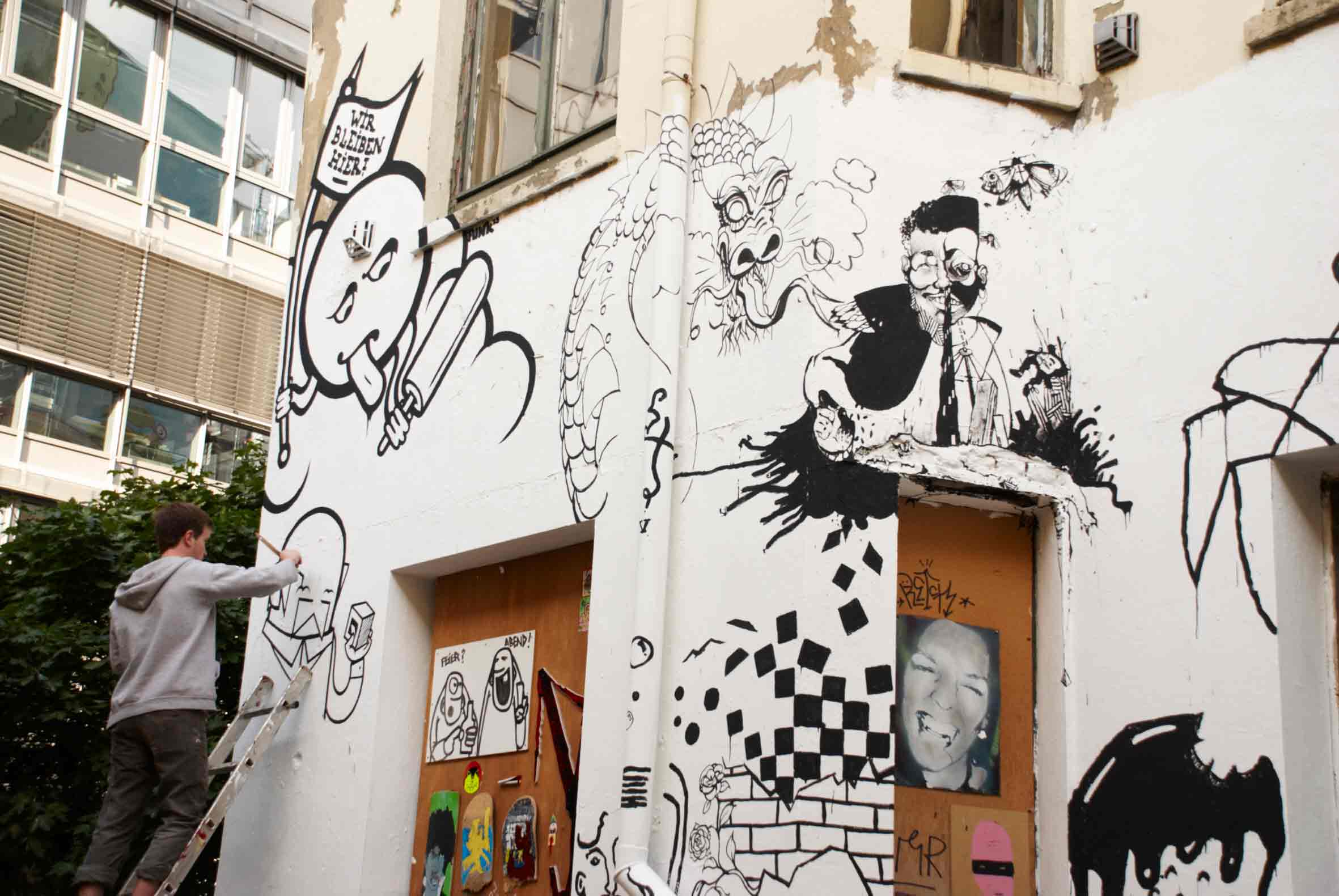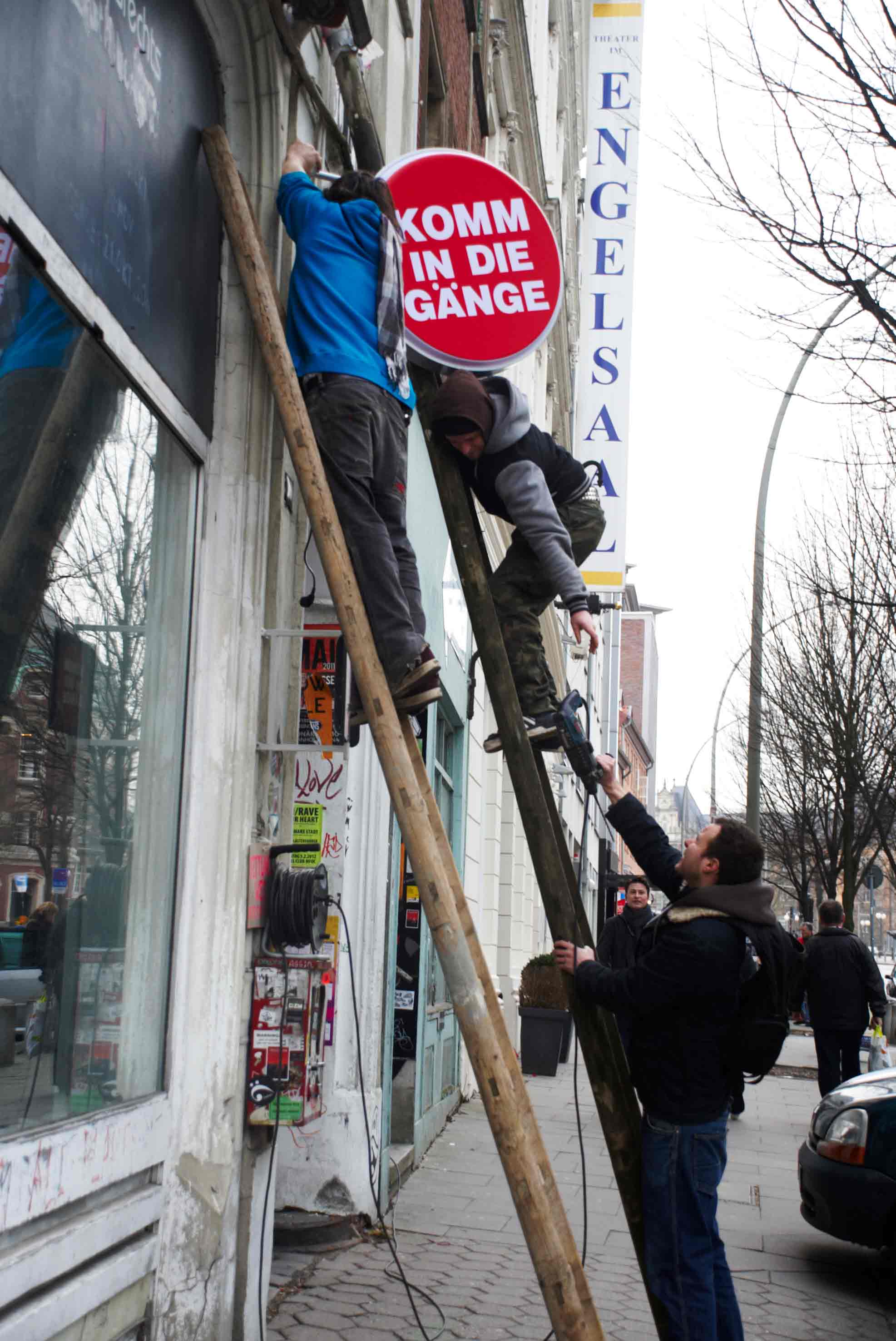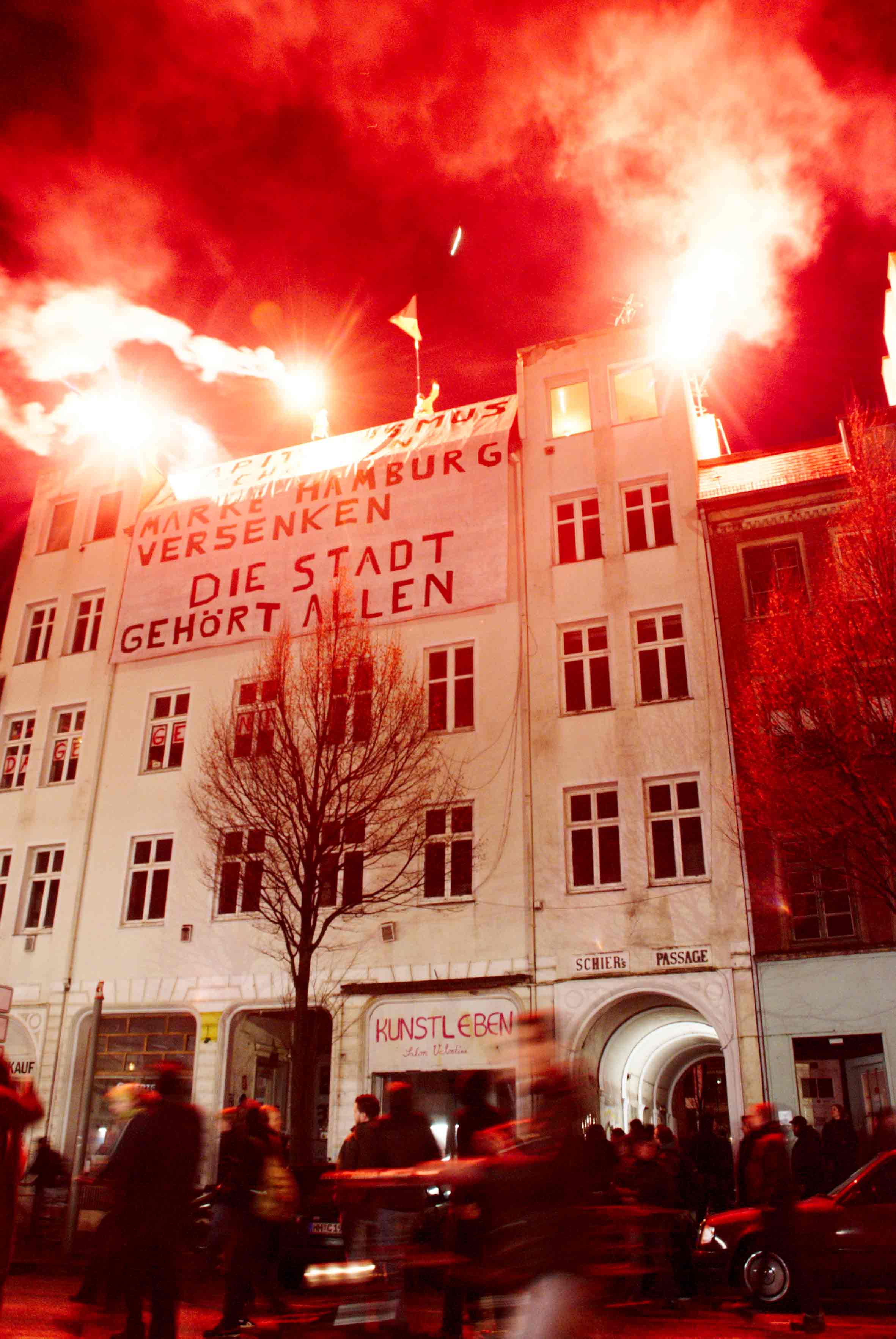 Earlier this year, a new kind of network had formed in Hamburg around several urban conflicts: Recht auf Stadt (Right to the city). Different initiatives connected and formed a political movement, in order to intervene in conflicts around the Rote Flora, the wagon-place Zomia, the Frappant in Altona, and also in the Gängeviertel. The network constituted the political basis that enabled the occupation and up until today its principles influence the everyday practice of the Gängeviertel. In November 2009, artists and creatives released the manifest “Not in our Name, Marke Hamburg!” in which they protested their role as a fig-leaf for the ongoing gentrification of the city.
