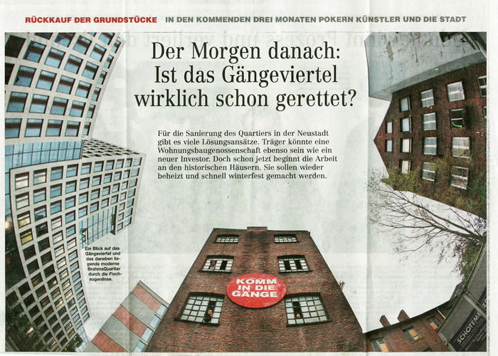 Im Oktober 2009 bezahlte Hanzevast die erste Rate für den Kauf des Viertels. Die Initiative räumte daraufhin die verkauften Häuser Fabrique und Druckerei, um Schadensersatzforderungen des Investors gegenüber der Stadt zu vermeiden. Die überwältigende öffentliche und mediale Unterstützung bewegte die Stadt schließlich dazu, mit dem Investor über einen Rückkauf zu verhandeln, der am 15. Dezember durchgeführt wurde. Seitdem wurde in langen Verhandlungen zwischen Stadt und Initiative versucht, einen gangbaren Weg für die gemeinsame Sanierung und für die Zukunft des Gängeviertels zu finden. Meilensteine auf diesem Weg waren die Unterzeichnung des Integrierten Entwicklungskonzepts (IEK) 2010, die Kooperationsvereinbarung 2011 und die Unterschutzstellung des gesamten Areals im gleichen Jahr. Zwar gab es im Verhältnis zwischen Behörden und Besetzer*innen immer wieder auch Konflikte, aber bis heute hat sich das Viertel in der politischen Auseinandersetzung durch Kreativität und Witz behaupten können. Und das wird hoffentlich auch in Zukunft so bleiben.
